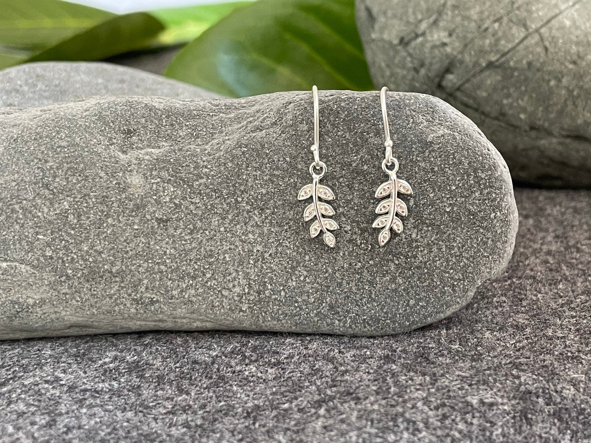 Olive Leaf Drop Earrings - 925 Sterling Silver with Cubic Zirconia CZ